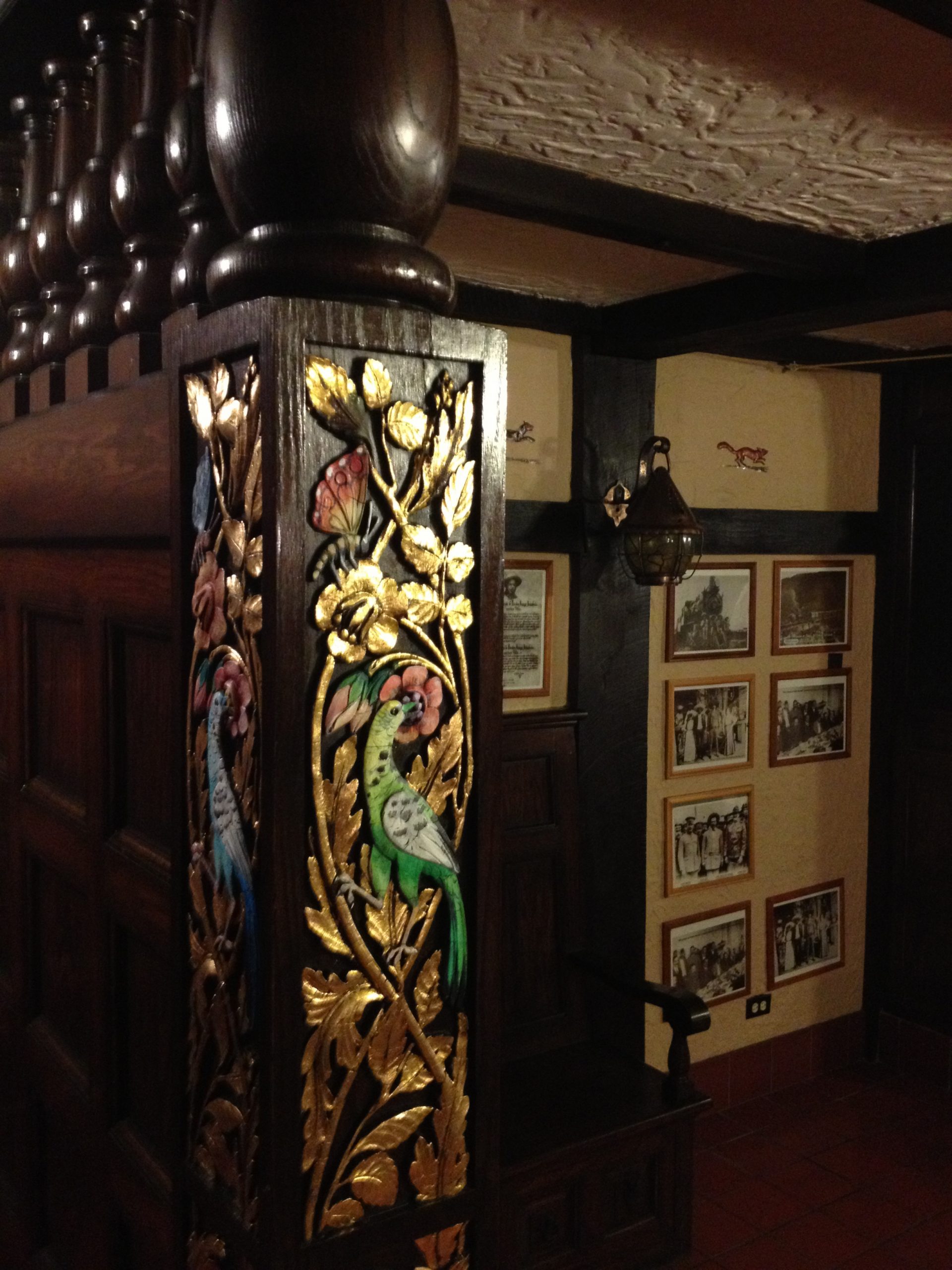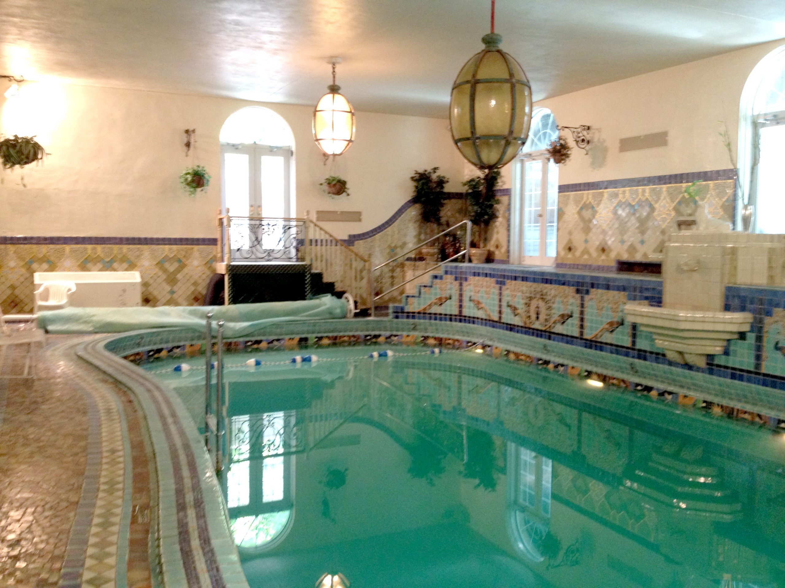 The lower level contains an enclosed swimming pool, finished in blue mosaic tiles. Adjacent to the pool is a two-lane bowling alley and an English pub/billiard room that can seat 50 people. A walk-in safe is located in a rear area. The owners have graciously opened their lovingly restored home for this great cause.